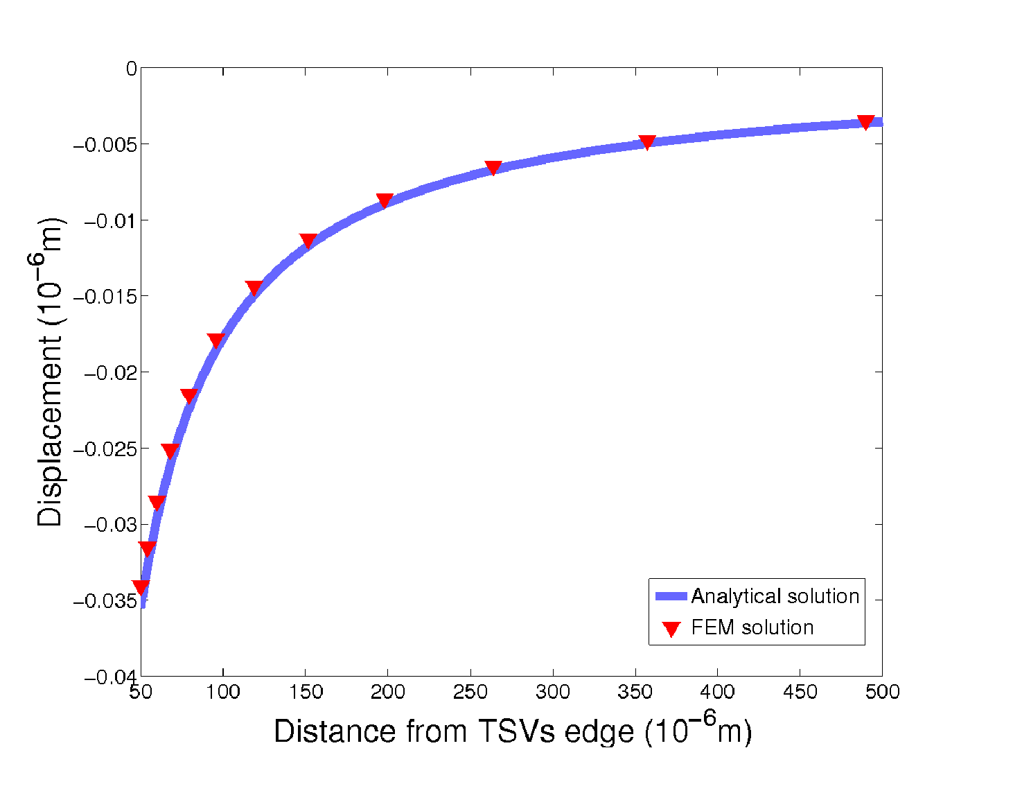 In Fig. 4.8 the displacement evolution in silicon along the radius of the TSV is shown in comparison with the exact solution given by (4.8) . One can notice that this approach also allows for the calculation of the exact solution for filled TSVs.