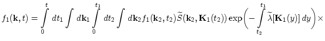 ![$\displaystyle f_{1}^{(2)}(\vec{k},t)=\int_{0}^{t}\,dt_{1}\int\,d\vec{k}_{1}\int...