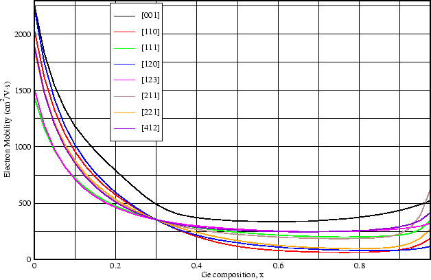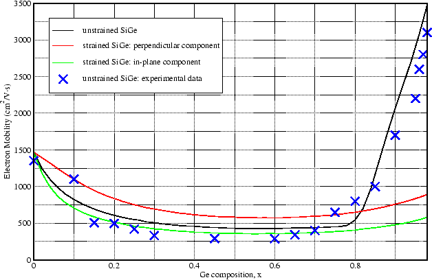comparison with unstrained SiGe. At very high Ge mole fractions the mobility in the unstrained case increases rapidly while for the strained SiGe it has