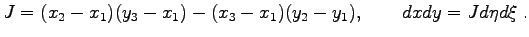 $\displaystyle J = (x_2 - x_1)(y_3 - x_1) - (x_3 - x_1)(y_2 - y_1), \qquad dx dy = J d\eta d\xi \; .$     (3.15)