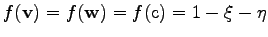 In the first case of the evaluation of the function $ K$ , the vertices $ \mathbf{w}$ and $ \mathbf{v}$ coincide and the point $ (0, 0)$ is used as point of the common vertex. The common shape function is denoted as $ f(\mathbf{v}) = f(\mathbf{w}) = f(\mathrm{c}) = 1 - \xi - \eta$ .