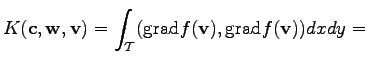 $\displaystyle K (\mathbf{c}, \mathbf{w}, \mathbf{v}) = \int_\mathcal{T} ( \mathrm{grad} f(\mathbf{v}), \mathrm{grad} f(\mathbf{v})) dx dy =$