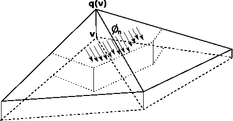 The finite volume scheme shown in Section 3.2.1 requires the following topological operations: from a vertex all incident cells are required (determination of the integration domain) and for these cells all incident vertices have to be traversed (determination of the function values). Such a traversal scheme is identical to the traversal scheme of finite elements which only have vertex-based shape functions.