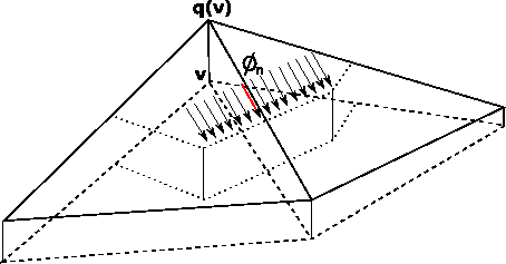 If further requirements of Section 3.2.2 are given or assumed, the evaluation of the finite volume differential operator is obtained by traversing all incident edges of the vertex and subsequently traversing the vertices on the edge for calculating the function value (on the edge only).