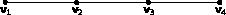 This example shows the application of the Poisson equation in a thermodynamic simulation. The equation system consists of four points from which two are boundary points with homogeneous Dirichlet boundary conditions. Furthermore a constant right hand source term is given which equals unity. The four points are given on a straight line in equal distances according to Figure 4.1. The governing equation yields