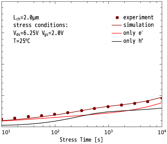The reason of the mentioned in the previous Section model fail for devices with Lch = 1.2 and 2.0um is that the concentration of interface states generated by electrons peaks outside the channel, thereby weakly affecting the device performance. Figure 3.5a, showing the average Nit (i.e. integrated over the interface and divided by the interface length), demonstrates that more severe degradation corresponds to a lower average concentration of interface states. Hence, longer devices are less sensitive to electron-induced Nit, suggesting that another mechanism leading to Nit created closer to the channel must be responsible for this discrepancy. One may envisage that the missing contribution to the damage is triggered by secondary generated (by impact ionization) holes which are accelerated by the electric field and thus create interface states shifted towards the source. Therefore, it is necessary to extend the presented version of the model (described in Section 3.1) in order to make it suitable to represent the degradation in transistors with different channel lengths within the same set of parameters.