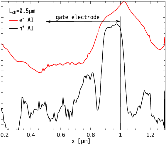 In Figure 3.8, which demonstrates the total Nit profile and the hole-related component of Nit calculated for 10s and 104s, one may explicitly see that the hole contribution is considerably shifted towards the source. The single-electron component generates traps situated outside the channel which explains why the hole-induced traps have stronger relative impact on Idlin. Only the SP-component was considered while analyzing the relative contribution of holes. For both types of carriers the AI is already too high, thereby saturating the MP rate for this process. As a result, it is impossible to distinguish between multiple-electron and multiple-hole contributions. Additionally, NMP is homogeneously distributed over x and speculations about the position-dependent impact of Nit on the device performance are possible only for the SP-component. The contribution of hot holes to the total concentration Nit (Figure 3.5b) is much less than the corresponding fraction of Idlin change. This trend becomes more pronounced for longer devices. Furthermore, such a behavior is also supported by Figure 3.6 where the experimental Idlin degradation is plotted against the theoretical one as well as the portion of Idlin change induced by electrons and holes only. Note that in the case of Lch = 0.5um the degradation may be represented employing only the electron-component, but this is not possible for longer devices.
