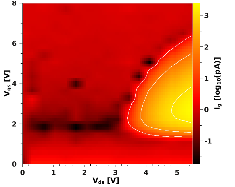 Long-channel n- and p-MOSFETs with a metallurgical gate contact length of 0.5um (the device architectures and the net doping profiles are sketched in Figure 3.9) have been employed for monitoring the criteria reflecting the severity of HCD. All lateral coordinates x refer to an origin placed at the left edge of the source contact for both devices. Together with a relatively high operation voltage this channel length ensures that the single-electron mechanism of the Si-H bond dissociation is the dominating one [41]. In the case of n-MOSFETs, the substrate current as a function of varying {Vds,Vgs} was recorded and binned onto a color map (Figure 3.10a). For p-MOSFET Ig = Ig (Vds,Vgs) was measured and depicted in Figure 3.10b.