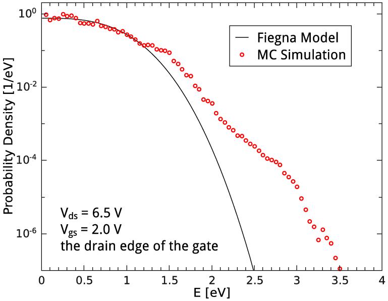 The most popular approach for analytical modeling of non-Maxwellian distribution functions is the Fiegna model [171,96]. This model is applicable for devices with a channel length longer than 0.5um which is suitable for our case. Within this approach the following expression for the DF is proposed