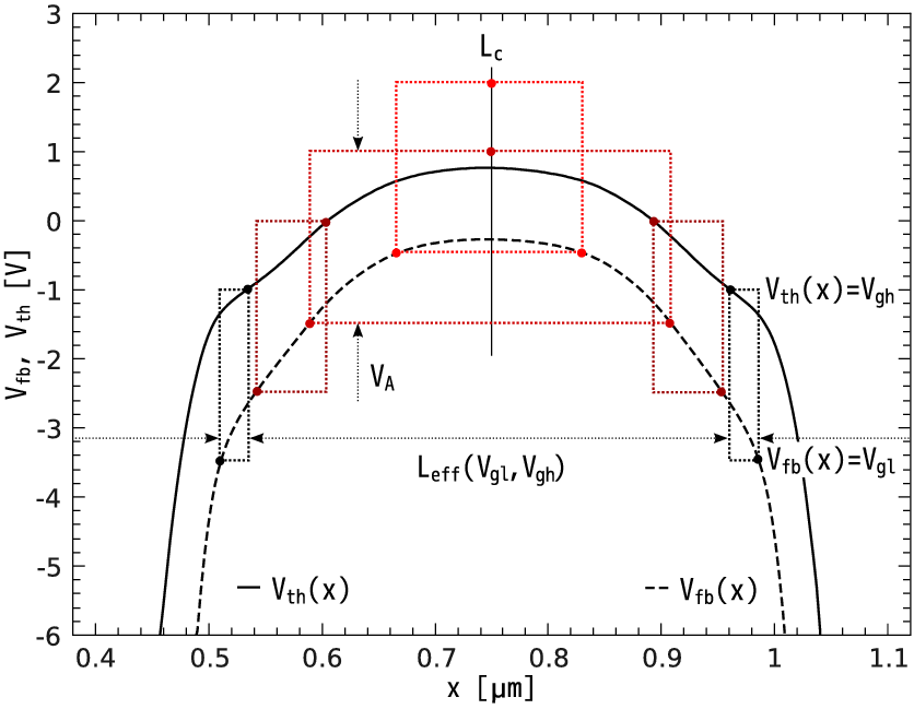 Therefore, the interface states in this overlapping region Leff are able to capture holes and electrons alternately. Through a repetition of the processes described above, recombination proceeds in Leff. In contrast, outside of the Leff region, the supply of either electrons or holes is insufficient for recombination to take place. Because the recombination process at position x begins almost abruptly when Vgh rises above Vth(x) or Vgl falls below Vfb(x) [173], the region in which recombination does proceed can be clearly distinguished from the region in which no recombination takes place in terms of the local threshold and flatband voltages. These findings lead to the conclusion that