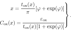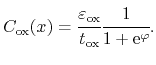 It should be mentioned that in (4.23) the parameter tox has been changed to tox(x). As reported in [185], this substitution is legitimate until dtox(x)/dx which is correct for devices with a real topology of the gate contact. The value of Cox(x) in (4.23) has a maximum with Cox(= εox/tox) in the middle of the gate and decreases gradually toward a much lower value outside the gate edge due to the fringing effect. At x→-∞ (or φ→-∞) the obtained equation (4.23) asymptotically turns into an expression for the parallel-plate capacitance (4.14).
