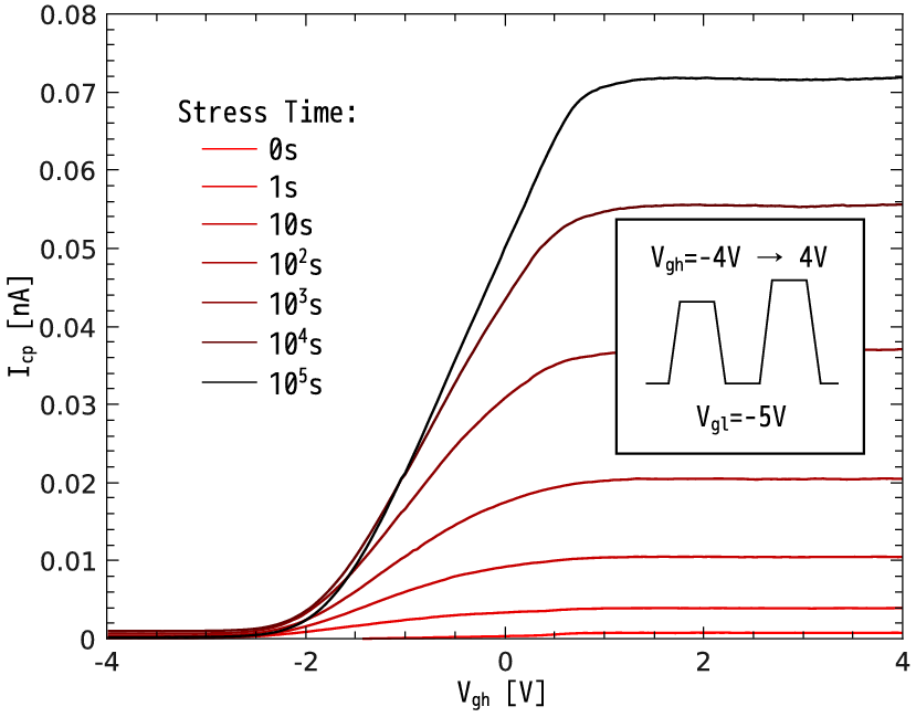 In [191,22,179,190] the impact of the bulk oxide trap Not and interface trap density Nit on the CP current has been analyzed. A change inNot(x) without changing Nit(x) results only in a local shift of Icp along the Vgh axis. On the other hand, an increase of Nit(x) without changing Not(x) will only cause a local increase of dIcp/dVgh. Thus, based on the shape evolution of the Icp and dIcp/dVgh curves for different HC stress times it is believed that no significant amount of oxide charges are generated under the chosen stress conditions. This fact is confirmed by a measurement of the threshold voltage shift ΔVth by the maximum transconductance method (see Figure 4.21b inset). The increase of ΔVth demonstrates the dominance of Nit generation during the entire measurement time (see Section 4.4). Simply speaking, the aforementioned facts allow us to conclude that system (4.32) is valid and applicable for the established stress regime. A comparison of the extracted and the simulated data with HCD model interface state density profiles for several stress times is demonstrated in Figure 4.22a.