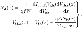 The Vth(x) distribution keeps its initial form corresponding to an undamaged device during HC stress only if the influence of the interplay between oxide and interface charges is small enough [174,175,176]. As explained in Section 4.3 in the case of the absence of a significant amount of oxide charges generated under hot-carrier stress one can use a simplified method for interface state density extraction and consider only the effect of Nit(x) on the calculated Vth(x). To be more precise, in the case of the technique with varying high level of the gate pulse, the extraction procedure can be reduced to a self-consistent solution of the system