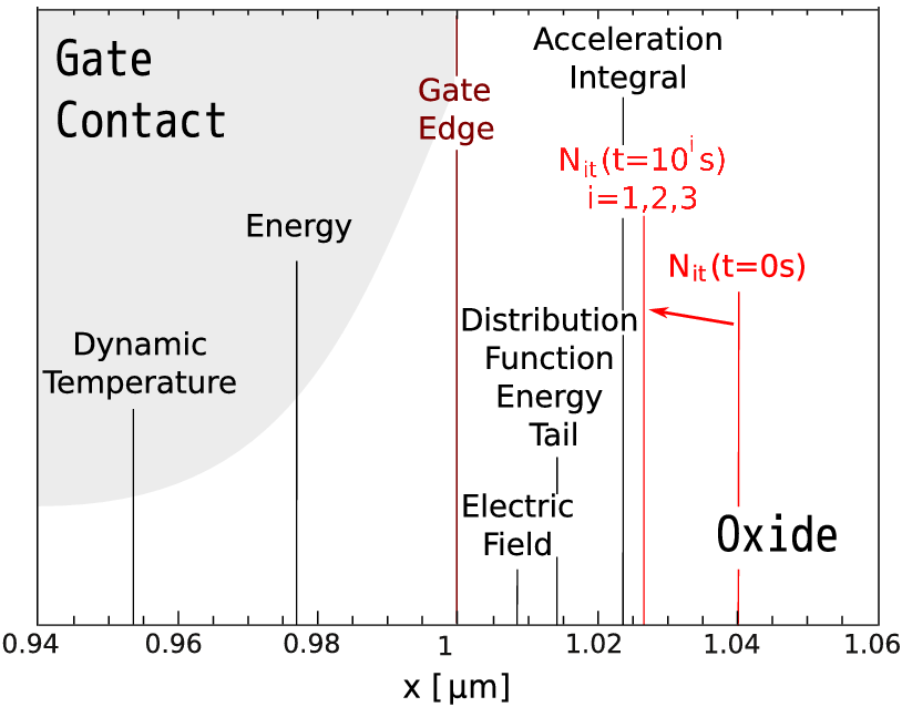 As mentioned in Chapter 1., it is usually assumed that the most severe hot-carrier degradation is localized of the electric field (or the driving force) peaks. This is because in this area carriers gain their maximum energy and the Si-H bond dissociation process is most intensive. However, the maxima of such physical quantities as the electric field, electron energy or dynamic temperature are not necessarily observed at the same position. Moreover, since both SP- and MP-processes are controlled by the AIs, just the maxima of these integrals correspond to the Nit peak. The AI maximum is controlled by the shape of the distribution function or - more precisely - the depth of the high energy tails. Therefore, the device area where the most extended tails of the DF are observed corresponds to the highest degradation dose. To conclude, it is rather important to compare coordinates for the most intensive trap creation, determined according to different criteria and the maxima of Nit (as well as Nit peak for the undamaged device). This information is provided in Figure 4.22b.