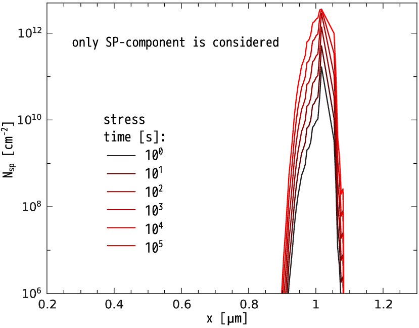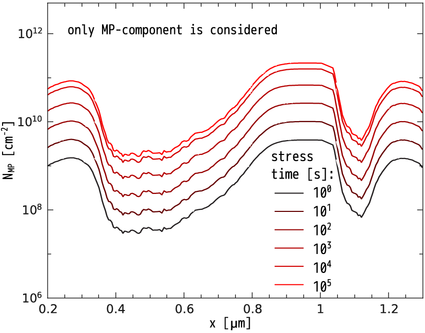 Note that the AI for the MP-process controls the interface state density via the prefactor (Pu/Pd) in expression (3.9) and thus its variation is not as large as in the case of the SP-component. Figure 4.24b shows that NMP represents the behavior of the corresponding AI. This means that electrons in the channel cannot reach high energies in this range and are "cold" from the perspective of the SP-process but still have sufficient energy to contribute to the MP-mechanism. In conclusion, the MP-component is present at all values of the x coordinate, in contrast to the SP-component which contributes only in a rather narrow region. It should be noted that only NMP is responsible for the flat plateau situated left of the maximum of the total concentration Nit (this plateau is schematically shown in Figure 4.22a).