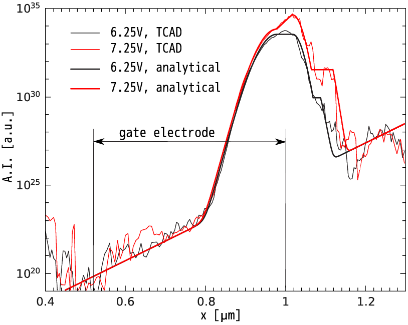 Since our aim is to develop an analytical model which does not use any information from the TCAD version (e.g. lateral profiles such as Nit(x) and I(x)), for the SP-process the average (over the interface) an effective trap concentration is introduced