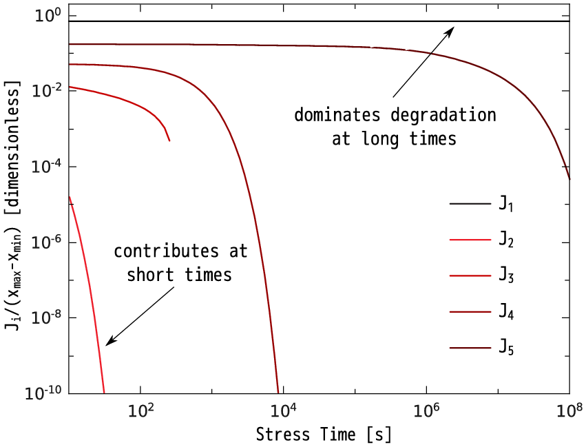 Figure 5.4a demonstrates the time dependences of the integrals Ji calculated for Vds = 7.25V. The terms Ji reflect the fraction of "virgin" bonds and a decay in Ji means that the dissociation process was triggered during this time period. It is evident that the "tip" of the AI peak (the term I2 of the AI and the J2 in ΔIdlin affects Idlin rather weakly already at t = 10s. In fact, I2 varies approximately in the range of 1034-1035a.u. (Figure 5.2a) and the criterion νtI1∼1 leads to bond-breakage events predominately triggered within the time period of 0.2s to 2s. In contrast, I1 varies by more than 11 orders of magnitude and thus J1 contributes to ΔIdlin over several decades and defines the degradation at long times. These considerations are summarized in Figure 5.4b where the time-dependent values of some Ji terms are substituted with constants. For instance, the term J1 does not substantially change during several decades (Figure 5.4a) and thus may be represented by the value J1(t=0). Figure 5.4b shows that during the time period of 0..104s terms {J2,J3,J5} are not significant and may be omitted.