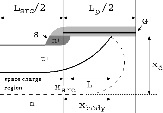 Wie die Bauelementsimulationen in Abschnitt 5.3 gezeigt haben, ist das Stromflußgebiet in Abhängigkeit der angelegten Spannungen sehr unterschiedlich. Speziell im Gebiet der Sättigung kann sich für höhere Drainspannungen von der Mitte der Grenzfläche der Driftzone zum Gateoxid zwischen zwei benachbarten Zellen eine Raumladungszone ausbilden. In der Quasisättigung ist diese Raumladungszone für die untersuchte Geometrie nicht zu beobachten. Diese Effekte sind aber natürlich auch geometrieabhängig. Die sehr komplexen Abhängigkeiten physikalisch fundiert in analytischer Form beschreiben zu wollen, ist nicht realistisch. Der in [90] unternommene Versuch ergibt trotz der nicht unwesentlichen Vernachlässigungen recht komplizierte Formeln. Außerdem geht er davon aus, daß sich zwischen Akkumulations- und JFET-Gebiet ein Minimum im Potentialverlauf ergibt. Dies ist nun bei geringen Gatespannungen (im Bereich der Sättigung) für höhere Drainspannungen nicht immer erfüllt (vgl. Abb. 5.13). Es wird bei diesem Ansatz jener Bereich, in dem sich eine Raumladungszone in der Mitte der Driftzone ausbildet, nicht richtig erfaßt.