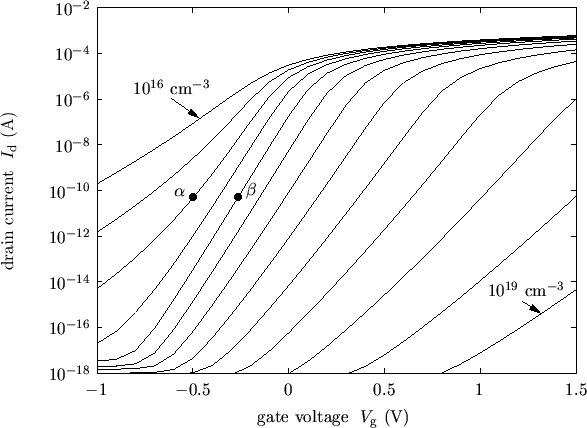 Fig. 2.1 shows a couple of transfer curves of a quarter-micron MOS transistor for different bulk doping levels. There exists a doping for which the subthreshold swing has an optimum. For higher doping levels the bulk effect becomes stronger like described above.