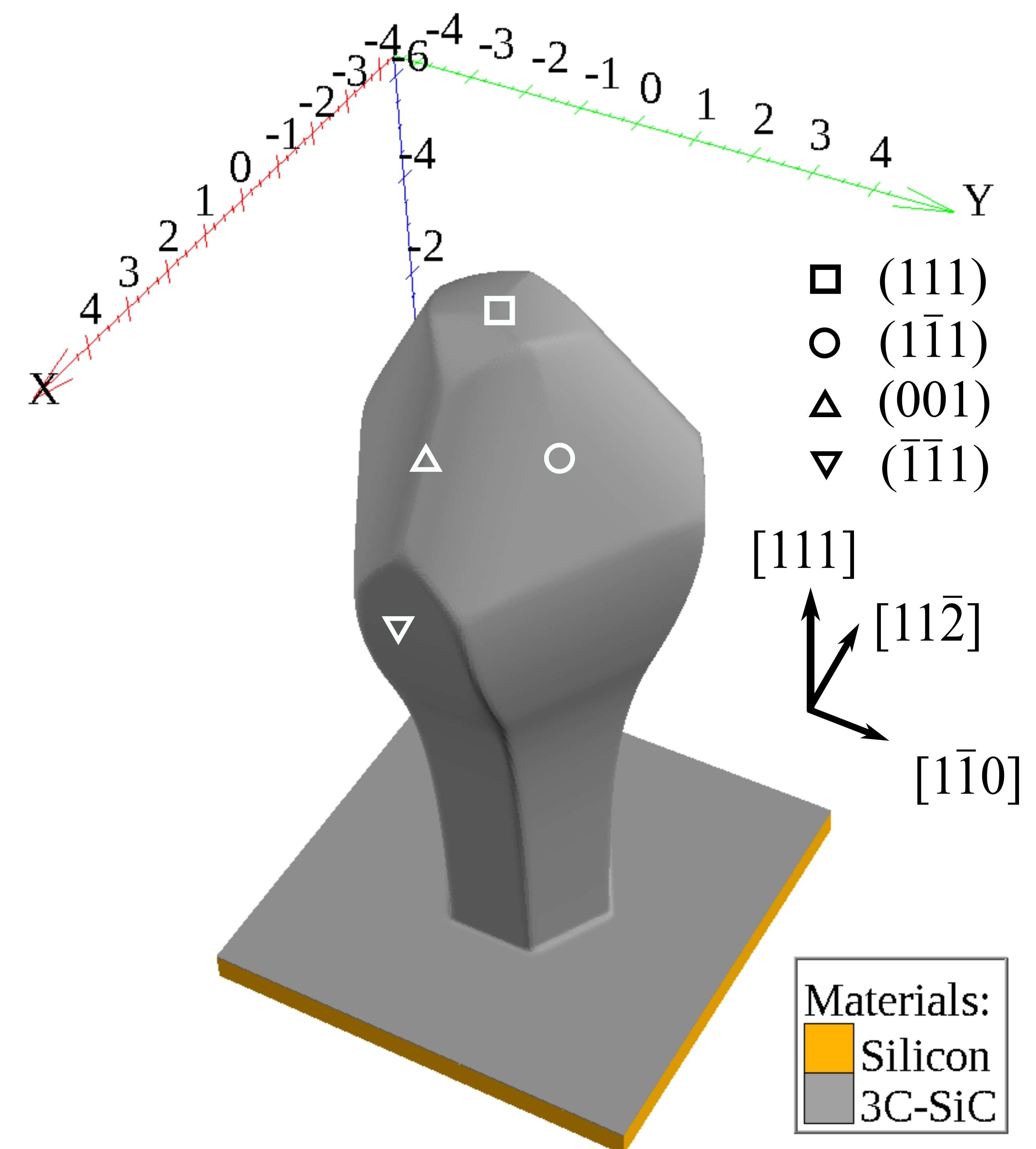 facets encountered in the previous chapters, the 3C-SiC micro-pillars and the sapphire substrates display a broader range of crystal facets. This is due to the tetrahedral crystal symmetry of 3C-SiC and trigonal symmetry