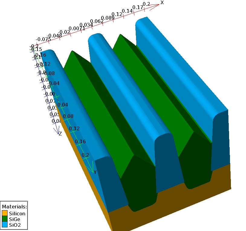 this section a further application is discussed: Selective heteroepitaxy of SiGe fins in trench arrays. The main motivation to grow SiGe crystals on substrates is to enhance carrier mobility in the transistor channel by means of introducing strain with SiGe layers [150]. In particular, SiGe crystals are used as source/drain stressors to improve hole mobility in p-type FETs [24]. The strain is induced by the hetero-interface between the SiGe film and