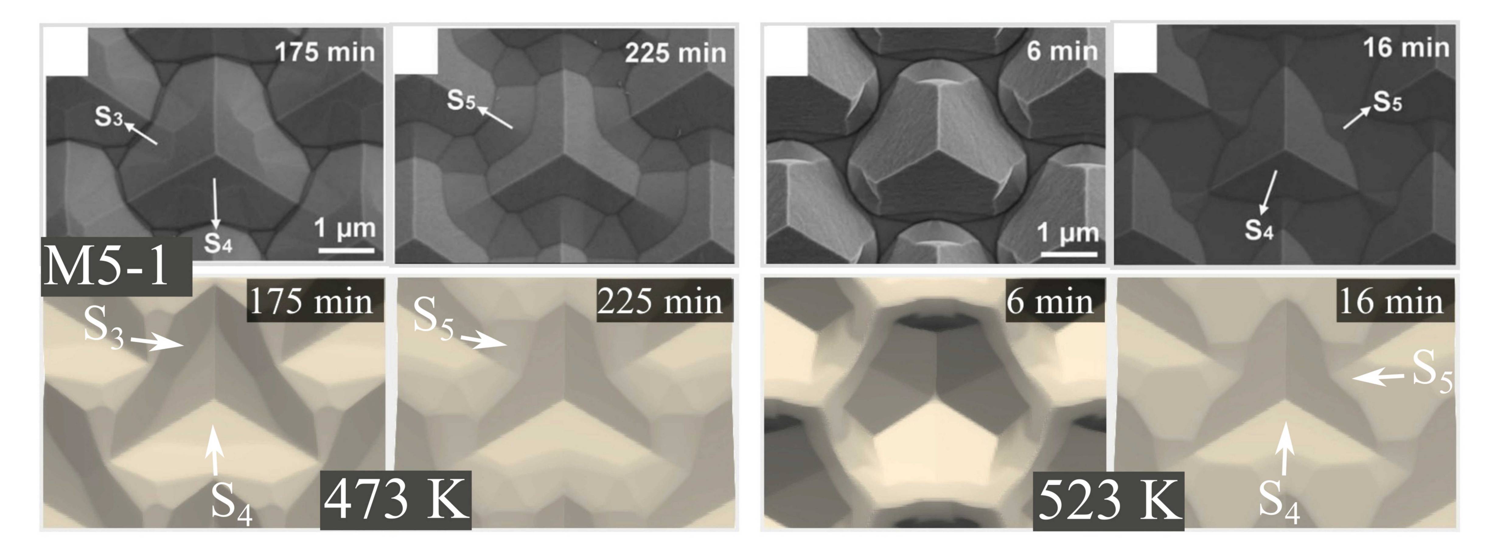 facets have not been observed for any of the investigated temperatures in case of M0-1. Again, the topography evolution argument can be applied to deduce that the corresponding