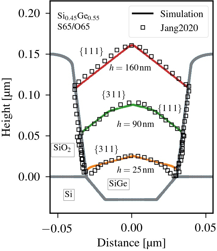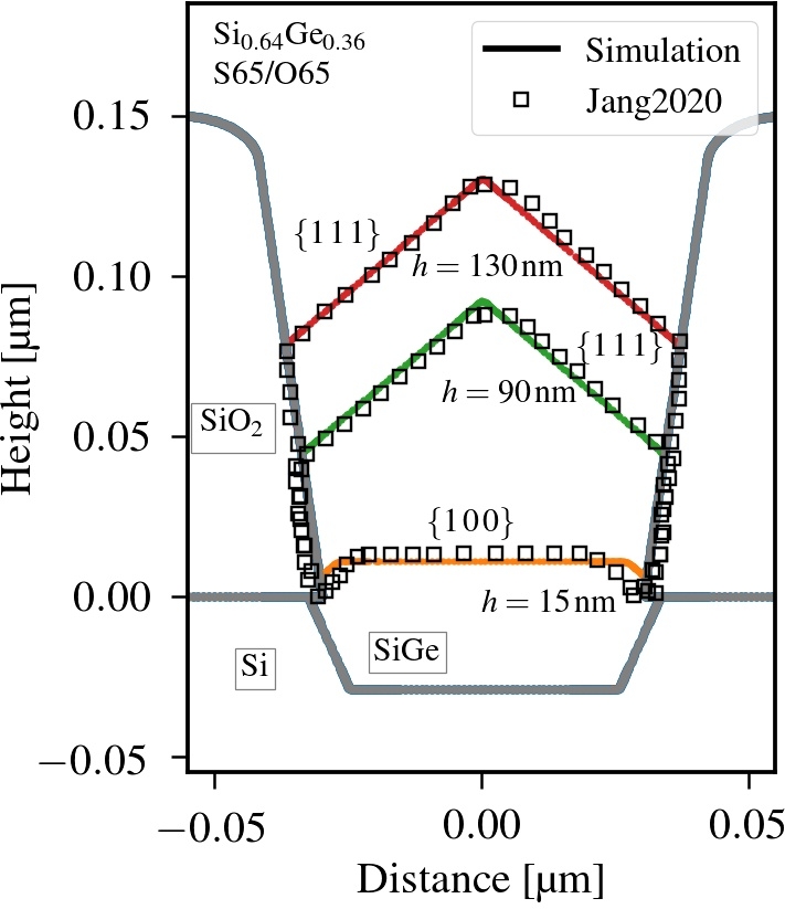 The individual processes presented here are part of a process sequence to fabricate a specific device. In order to focus on SEG and anisotropic wet etching steps, all other steps, such as dry etching, are not modeled with physics-based models. Instead, geometric process emulation is employed: The topography resulting from these fabrication processes are replicated, using purely geometric surface propagation, i.e., ideal profile evolution based on geometric quantities (e.g., film thickness). This approach allows to produce the exact initial topography for the subsequent SEG or anisotropic wet etching step. Hence, the assessment of the capability of the level-set continuum models for the four anisotropic processes is enabled. In all cases, the simulation results are compared with experimental observations, which allows for verification of the simulation methodology.