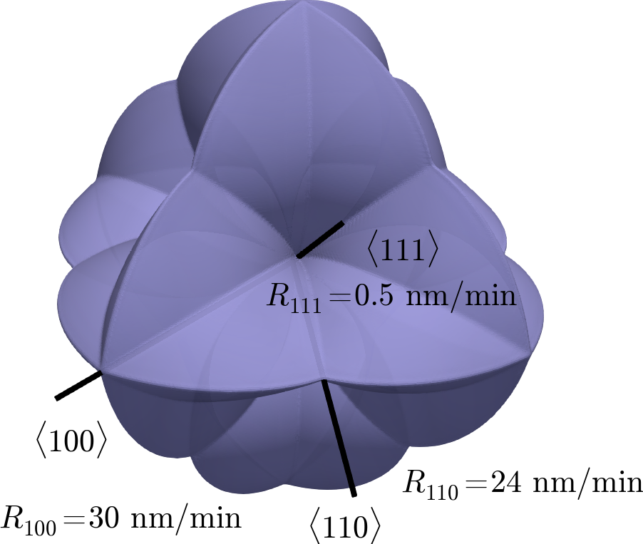 magnitude. Nevertheless, the etch rate distribution is complex, due to the multiple local extrema. Moreover, the defining crystal directions all reside in a section that is smaller than a quarter of the fundamental domain (see