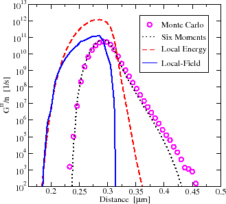 In many applications, local-field based models deliver good results. However, from the physical point of view, impact-ionization is not field dependent. This is especially important in areas of rapidly changing electric fields and in small devices. This weakness can be observed in Fig. 5.4 for a 200nm and a 50nm structure. This figure compares generation rates calculated using different transport schemes. In this example, the electrons are accelerated from left to right. As soon as the electric field is risen, the local-field model predicts the carrier generation rate. However, physically more correct are the Monte Carlo reference simulations. They demonstrate that the carrier energy can follow changes in the electric field with a certain delay. At characteristic lengths shown in that figure, the validity of the local-field approach becomes questionable.