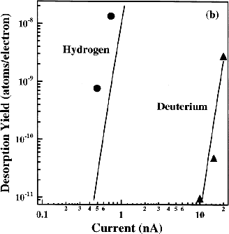 An experiment supporting the MP theory was performed on hydrogen and deuterium passivated surfaces using a tip of an STM (scanning tunneling microscopy) as a source of carriers tunneling through the vacuum [232]. The surfaces were bombarded by carriers below the threshold energy and the experiment showed that the deuterium passivated surface was much more robust against the electron bombardment than the hydrogen passivated one. In the former case, as shown in Fig. 6.1(a), a much higher current is required to gain the same desorption yield [233]. Two mechanisms have been identified to cause this behavior which were summarized by Hess et al. [230]: The first effect is the higher bonding energy between deuterium and silicon, also known as the large isotope effect. But the differences found in the desorption rate are much higher than the difference of the bonding energy would suggest. That's why this effect is also called the giant isotope effect of hydrogen. The reason for this huge impact was found to be the multiple vibrational excitation of the Si-H and Si-D. Bonds are excited by collisions with many carriers and lifted to higher energy levels until the bonds eventually dissociate. This is true for both, hydrogen and deuterium passivated surfaces. However, since the localized deuterium vibration is more closely matched to the silicon bulk, a more efficient cooling of excited bonds takes place. This leads to reduced bond heating and in consequence to a lower probability of deuterium desorption via the multiple collision mechanism. The behavior of hydrogen bonds at surfaces is comparable to the behavior of them at interfaces. Therefore, one may use the same conclusion to explain why MOS devices passivated with deuterium instead of hydrogen appear to have a higher resistivity against HCD [234]. The difference in the degradation process can be observed in Fig. 6.1(b). As a side effect, this experiment also confirms that interface bond breaking plays an crucial role in device degradation [235].