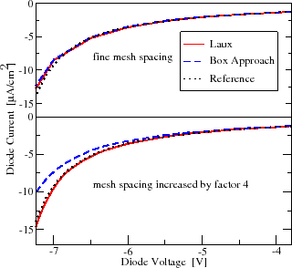 Simulations on the diode structure clearly show that the mesh dependency is higher for the two box based discretization schemes. Using a high mesh density results, as expected, in a comparable output for all three discretization methods. Using a coarser mesh spacing, the results using Laux's scheme change very little, whereas the two box based schemes show larger deviations. In Fig. 7.10 an example using the diode clearly shows that an increased mesh spacing leads to a shift of the breakdown voltage using the box based schemes, whereas only a very small shift is observed using the scheme by Laux.