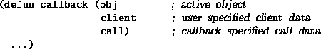 The concept of callbacks already used in the VBS library was adopted to the VLisp interpreter and allows asynchronous event activation when the interpreter is idle. The structure of a LISP callback is shown in Figure B.1 and is identical to the corresponding definition in C in Section A.1.