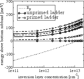 In Figure 6.12 the three lowest subband levels and subband populations for a substrate with (001)-orientation are given at three stress configurations. Figure 6.12a and 6.12b show that a tensile stress along [100] causes the primed ladder, being fourfold degenerate in the unstrained case, to split into two ladders with twofold degeneracy. A stress of 1 GPa is able to shift up in energy one of these ladders (the unprimed one) such that the population of this ladder is below 2% at all inversion layer concentrations.
