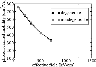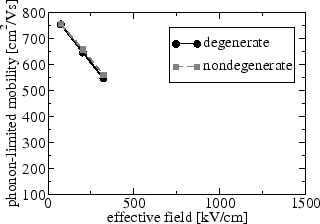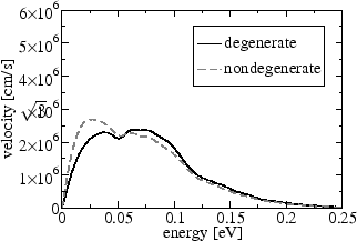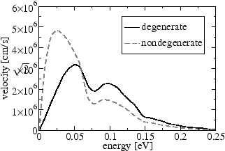 As a final observation from Figure 6.24 and 6.25 one can see that due to degeneracy effects electrons at energies below the Fermi level have smaller mean velocities, which corresponds well to the general picture that highly occupied states have little contribution to transport.
