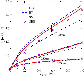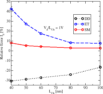 calculated with the DD, ET, SM, and the reference SHE model are shown. While the relative error of the current calculated