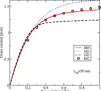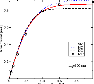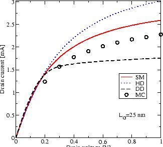 delivers a clear underestimation of the drain current, while the energy-transport model