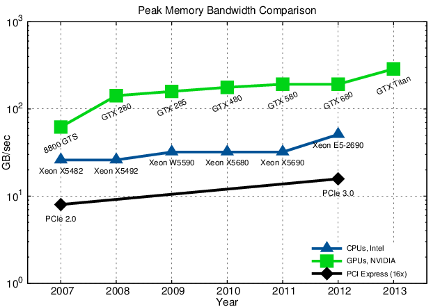 At the time of writing, it is common practice to augment nodes of supercomputers with accelerators, such as graphics adaptors and so-called coprocessors. For instance, Titan utilizes NVIDIA Tesla K20 graphics processing units ( GPUs) [141], where Stampede instead uses Intel Xeon Phi SE10P coprocessors [145]. In general, accelerators offer high core numbers and an excellent peak performance/watt ratio when compared to common shared-memory clusters [146]. However, one of the fundamental limitations is the connection with the host system via a connecting bus. The bandwidth and latency of such a bus system, e.g., PCI Express, are inferior compared to, for instance, the host’s memory bus, resulting in a significant communication bottleneck. Figure 5.6 compares the memory bandwidths of typical CPUs with accelerators and the PCI Express bus [147]. To overcome this problem, processor vendors aim to integrate the accelerators on the CPU die, thus eliminating the need for a slow bus system [148]. However, if the applications can be tuned to minimize such communication in the first place, accelerators are capable of providing outstanding performance with simultaneously reduced energy consumption, heat dissipation, and costs.
