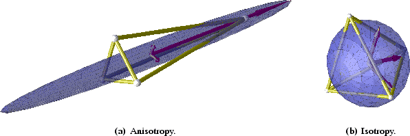 Appendix A gives a full representation on how PCA is used to find a quantitative description for the geometric property of a tetrahedron. However, PCA analysis for a tetrahedron forms a quadratic surface which can be used as measure for anisotropy, i.e. roughly speaking if PCA comes up with a sphere the tetrahedra is more regular (isotropy). If it forms an ellipsoid, than the tetrahedron is said to be anisotropic, see Figure 2.5.