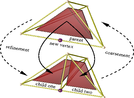 are refined by recursive tetrahedral bisection. Regions which have been refined