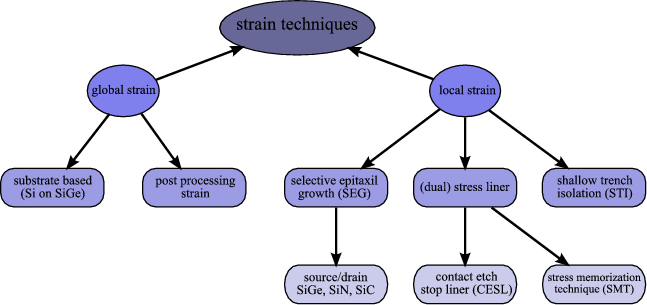 Strain techniques can be classified into two main categories. There are global strain techniques, where strain is introduced across the entire substrate, and local strain techniques, which insert strain locally at certain places. An overview of widespread strain technologies is depicted in Fig. 2.5. In the following chapter several common strain technologies are reviewed.