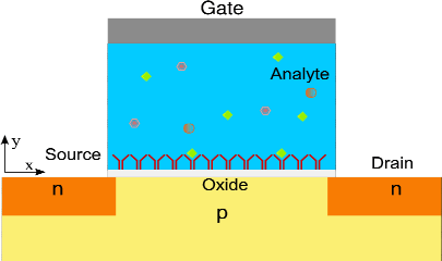 ) and has two tasks the first is to isolate the channel of the FET from the liquid and the second is to electrostatically couple the surface layer charge into the channel. On top of the dielectric is a biofunctionalized layer which exhibits immobilized biomolecule receptors able to bind the desired molecule.