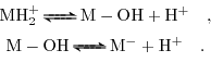 Unlike for electrostatic forces which act over long ranges, chemical reactions only occur within molecular distances. Therefore the assumption that chemical reactions are only possible within the OHP is chosen. Firstly, ionic species from the dissolved salt hold a water shell and cannot come closer to the interface than the OHP. Therefore, ions cannot contribute to the chemical reactions at the insulator interface (neglecting the possibility of specific adsorbtion of salt ions). Secondly, the much smaller hydrogen ions are not blocked by the OHP, due to their much smaller ionic radius and being not hydrated. They can approach the interface close enough to enable chemical reactions. As depicted in Fig. 5.3 the surface of an insulator inhabits a huge amount of unsaturated bonds. Neglecting unspecific adsorbtion, the only ions capable of bonding these sites are the hydrogen and hydroxyl ions [196,197,198], because they are not shielded by water layers. The following chemical reactions are dynamically balanced in the membrane, under the assumption of thermal equilibrium and without any net reaction5.3: