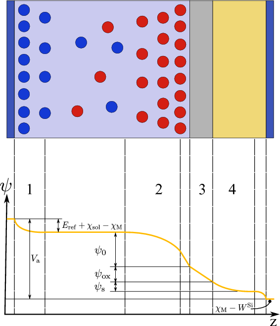 Fig. 5.5 shows the electrostatic potential difference occurring due to the charge diffusion driven by the differences in work functions. Due to the insulator, there is no current flowing through the structure under equilibrium conditions. Therefore, the potential drops between the metal and the semiconductor, and between the metal and the electrolyte, are constant and do not depend on the applied bias [205]. Additionally the potential drop from the Stern layer was conjoined with the potential drop across the electrolyte, shown in Fig. 5.5. For a given bias
