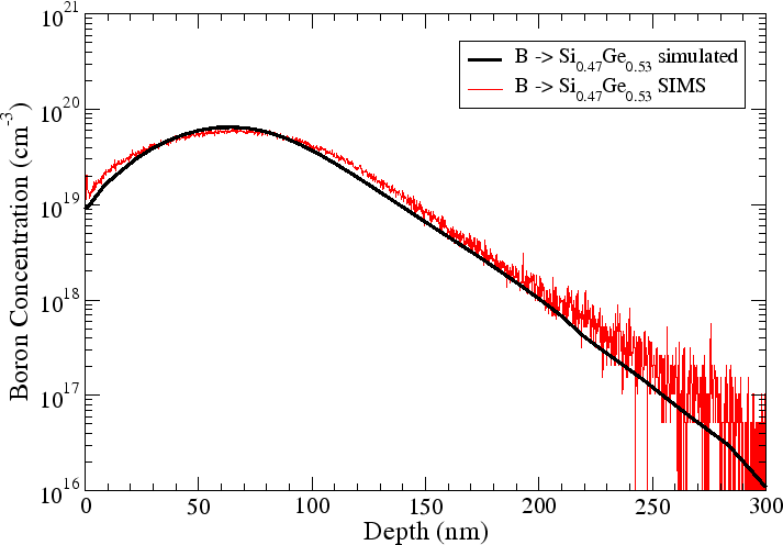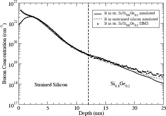 Fig. 4.8 shows that the simulated boron profiles in strained and