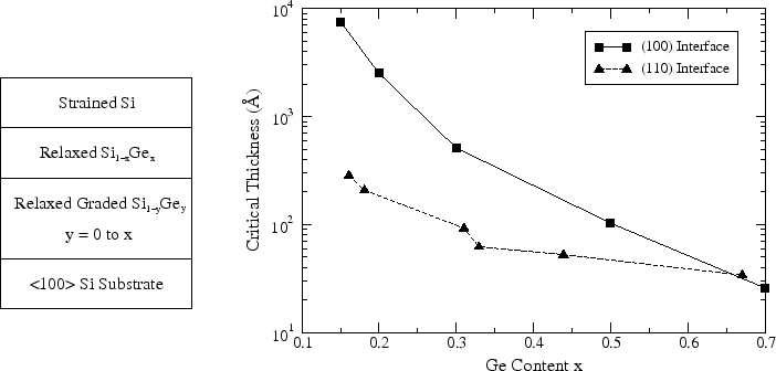 Fig. 4.6 shows the strained-Si/relaxed-SiGe heterostructure which is used to investigate the impact of strain on ion implantation. Relaxed SiGe layers are epitaxially grown on (100) silicon substrates using a grading technique to obtain the desired Ge composition. Next a constant composition layer is grown to spatially separate the subsequently grown strained silicon layer from the misfit dislocations contained in the graded SiGe layer. When silicon is grown on SiGe, the lattice mismatch between the two materials can be accommodated by uniform lattice strain in sufficiently thin silicon layers [102]. If silicon is grown beyond its critical thickness, the strained crystal relaxes to its natural size and a high concentration of dislocations is introduced. Fig. 4.6 shows also typical experimetal data for the critical layer thickness which depends on growth rates, growth temperature, SiGe surface orientation, and mostly on the Ge concentration [96].