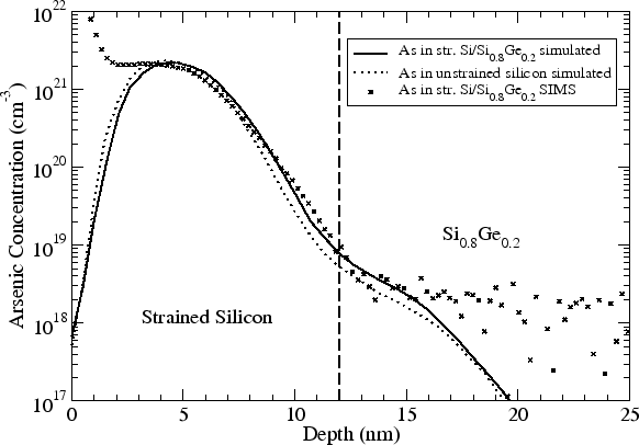 arsenic distribution in strained silicon has a slightly deeper penetration
