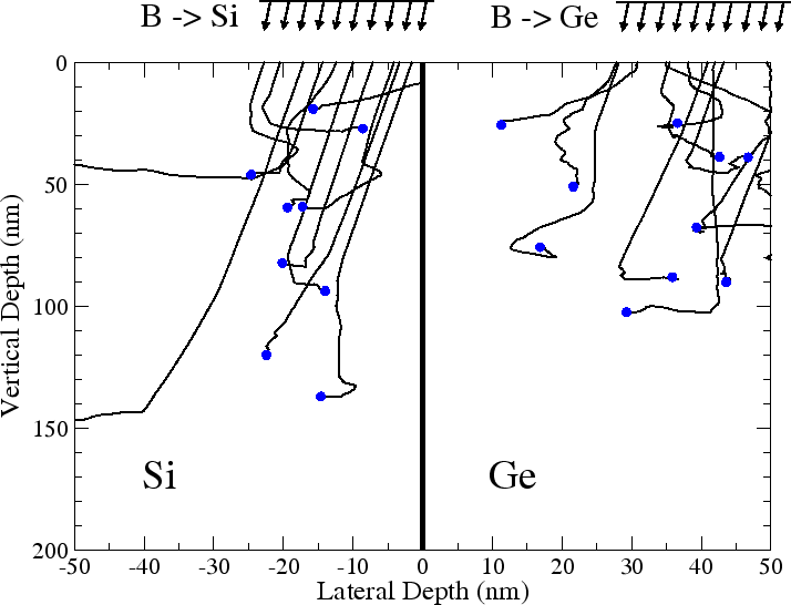 of ten arbitrarily selected boron trajectories in silicon and in germanium.