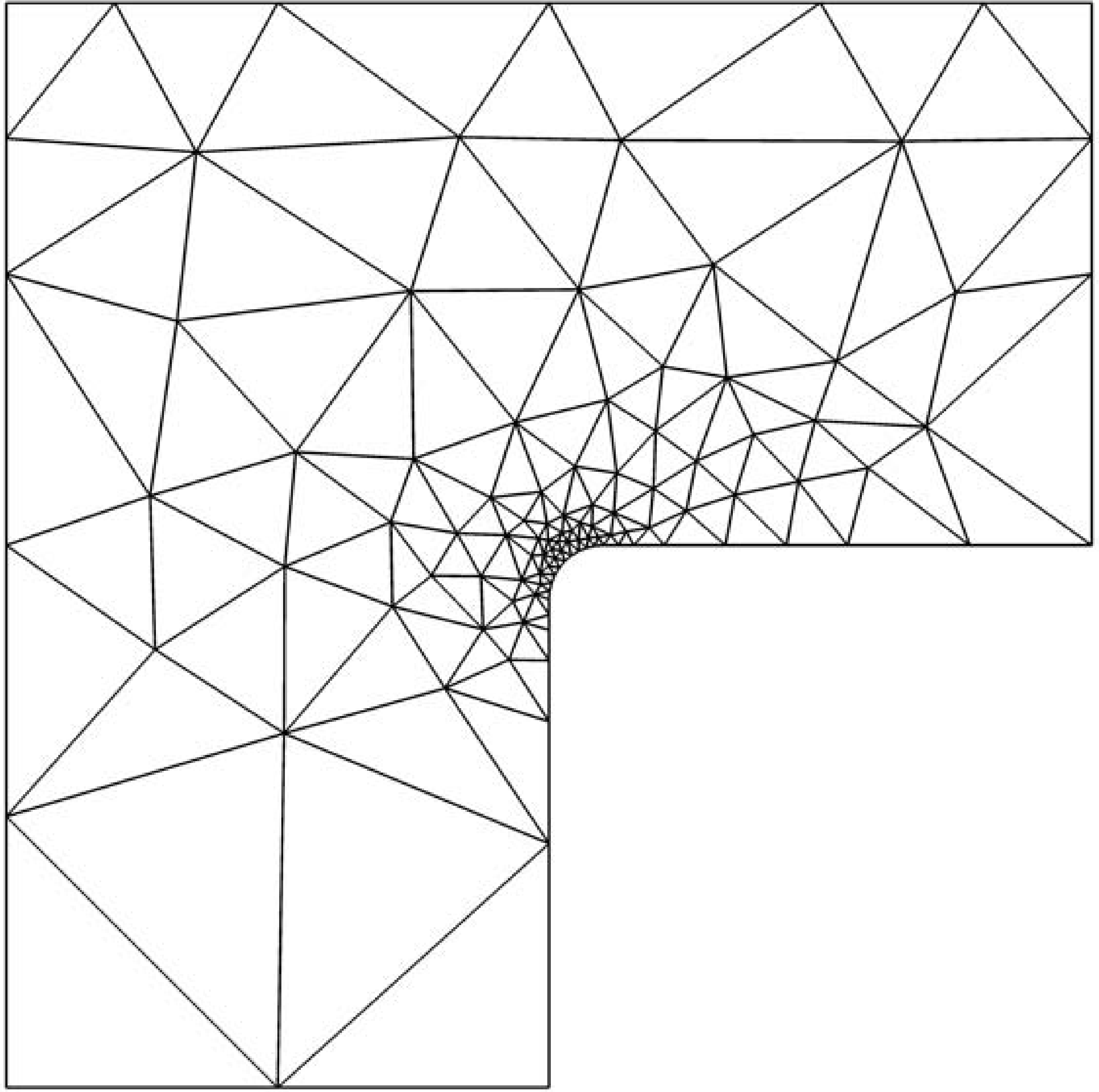 shaped 2D domain. The mesh is refined at locations of higher interest and